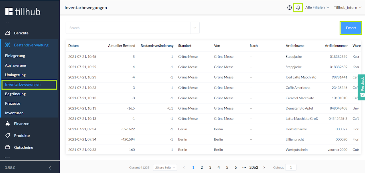 Über den Button "Export" können Sie diese herunterladen. Mit Klick auf das "Glocken-Symbol" am oberen rechten Bildschirmrand gelangen Sie in die Benachrichtigungen, wo Sie anschließend den Export der Inventarbewegungen einsehen können.
