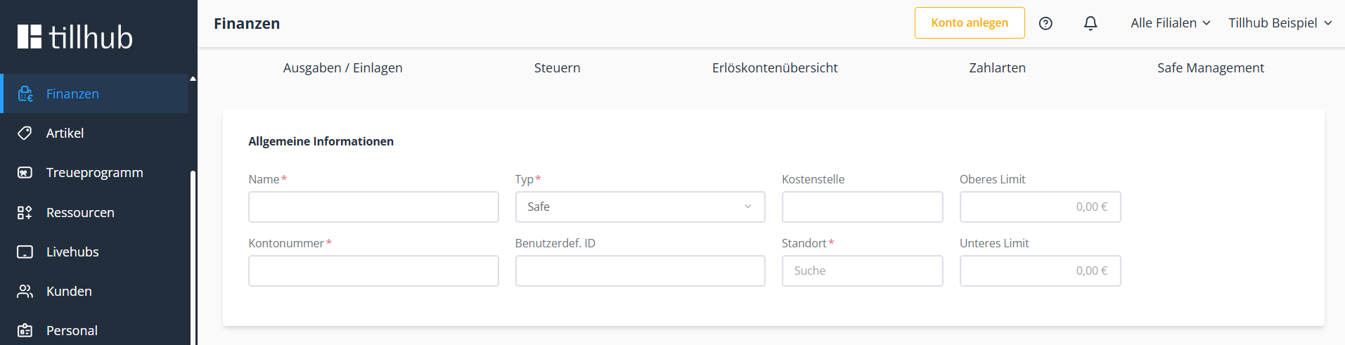 Wenn Sie an unserer kostenlosen Safe-Management-Funktion interessiert sind, schicken Sie bitte eine E-Mail an info@tillhub.de, damit wir Ihnen diese Funktion freischalten können. Nach der Freischaltung tauchen neben dem Reiter "Zahlarten" ein weiterer Reiter namens "Safe Management" auf.
