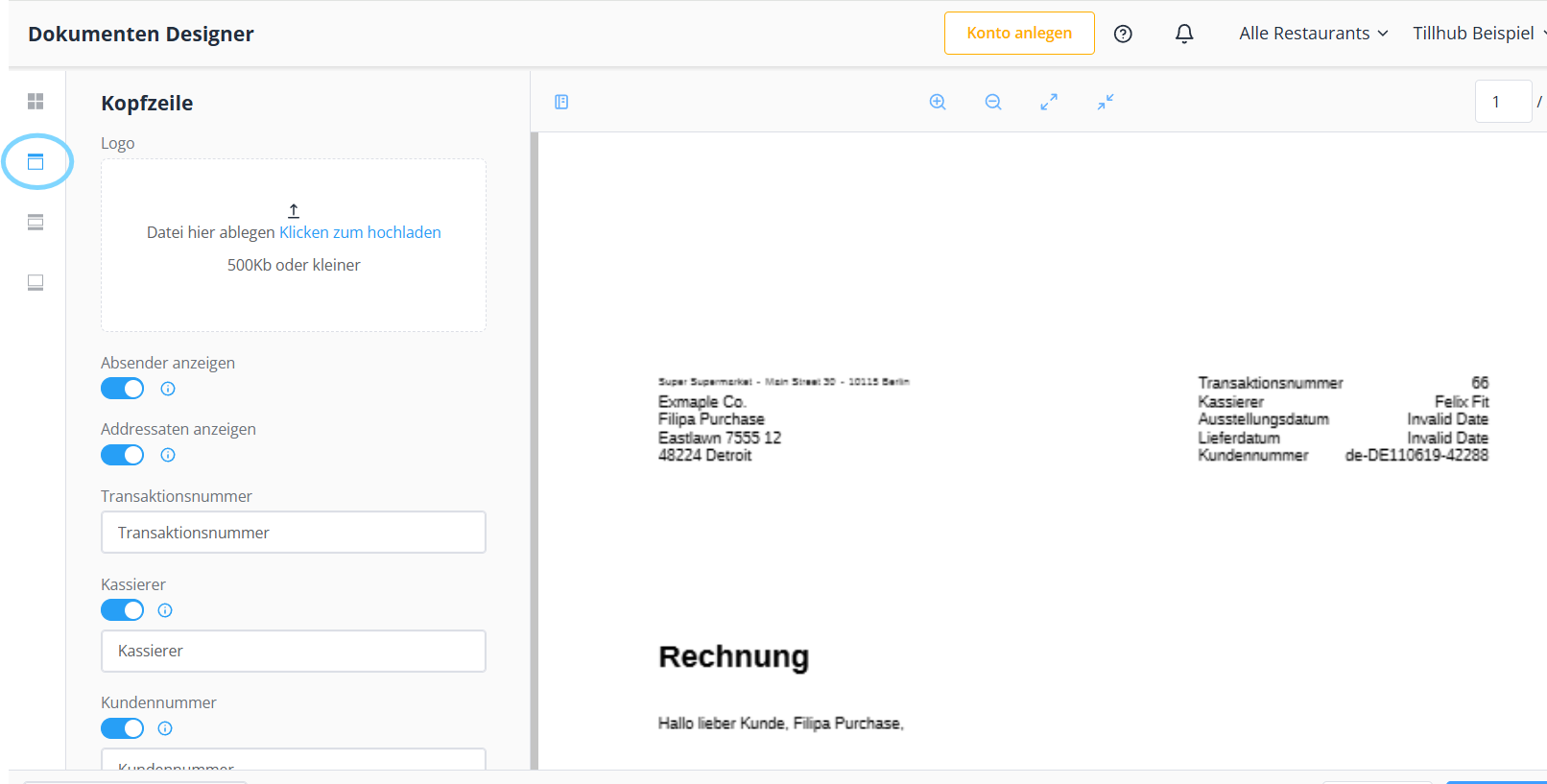 Haben Sie den "Allgemein" Bereich wie gewünscht angepasst, fahren Sie mit der "Kopfzeile" fort. Hier können Sie das "Logo" einstellen, festlegen ob "Absender" und "Adressdaten" angezeigt werden und die Beschreibungen für "Transaktionsnummer, Kassierer und Ausstellungs-/Lieferdatum" ändern.