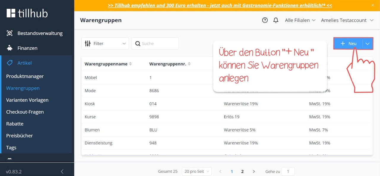 Gehen Sie links im Hauptmenü zunächst zu "Artikel". Anschließend klicken Sie auf Warengruppen und wählen Sie oben rechts den blauen Button "+Neu" , um eine neue Warengruppe anzulegen.