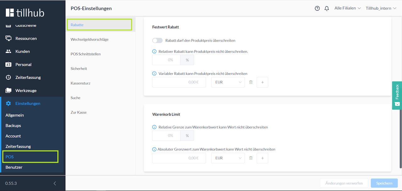 Sie können zudem festlegen, ob bei einem Kassensturz die Kassenöffnung bzw. der Kassenabschluss Pflicht sind und einzelne Komponenten in der Summe des Warenkorbs ausblenden.