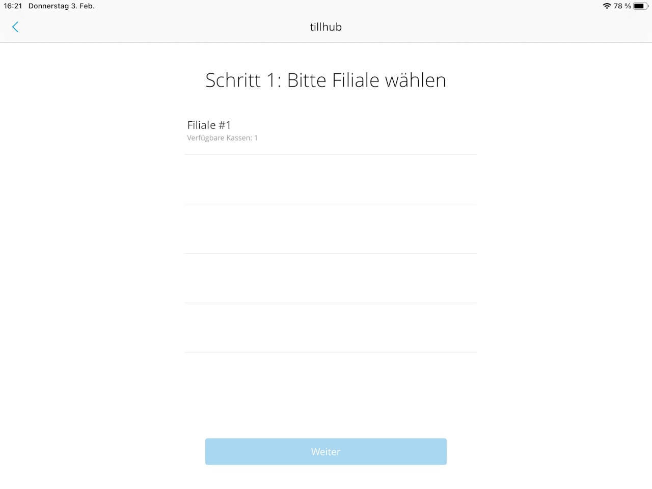 Schritt 1: Je nachdem, wie viele Filialen Sie in Ihrem Onboarding-Beratungsgespräch angegeben haben, steht die entsprechende Anzahl hier zur Auswahl. Wählen Sie die jeweilige Filiale aus. Tippen Sie anschließend auf "Weiter".