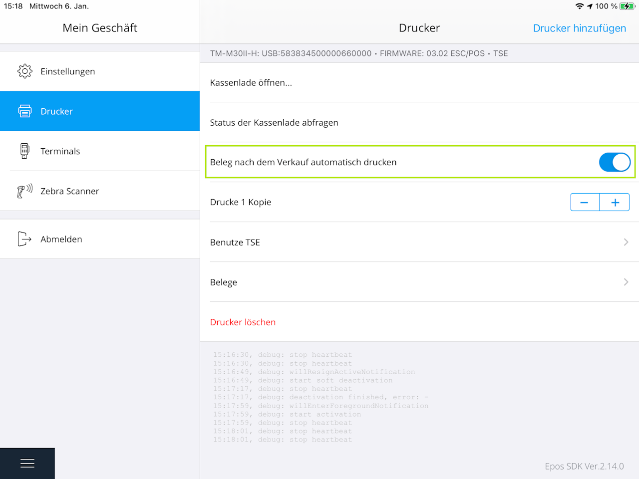 Im Anschluss können Sie noch auswählen, dass Belege nach dem Verkauf automatisch gedruckt werden sollen.