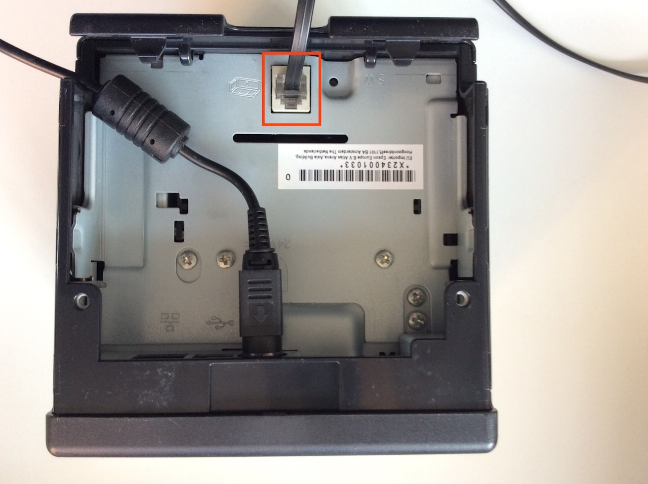 Stecken Sie das Kabel der Kassenschublade in die RJ45 Buchse ein und schließen Sie die Abdeckung wieder.