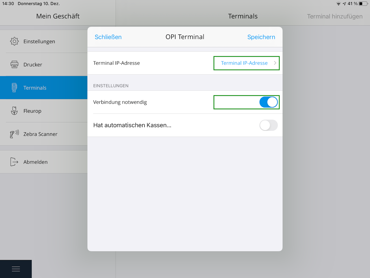 Im nächsten Fenster aktivieren Sie den Regler bei "Verbindung notwendig" und tippen auf das blaue Terminal IP-Adresse, um die IP-Adresse Ihres Terminals einzutragen.