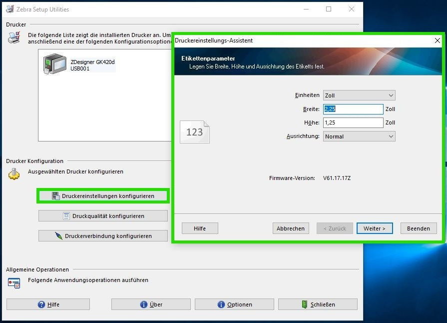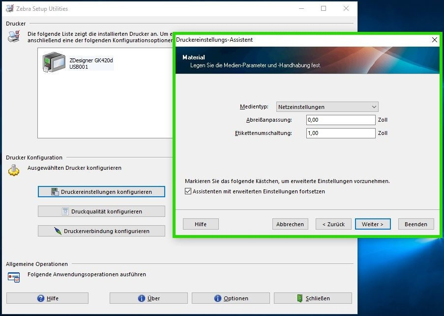 Öffnen Sie im Anschluss Zebra Setup Utilities. In dem sich geöffneten Fenster klicken Sie auf "Druckereinstellungen konfigurieren" und übernehmen die Werte aus folgenden Screenshots.