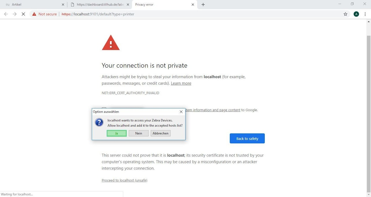- Hinweis: Beim ersten Mal, wird sich nun ein Fenster öffnen, was Sie auf einen Fehler hinweist. Dies passiert ausschließlich beim ersten Druckvorgang, den Sie durchführen möchten. In den folgenden Schritten zeigen wir Ihnen, wie Sie diese Meldung umgehen.