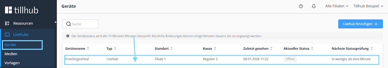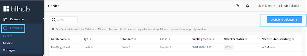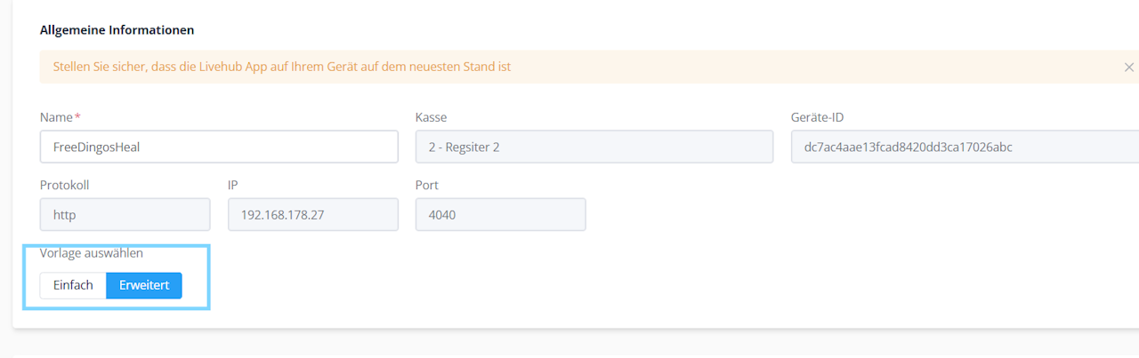 Gehen Sie dazu in den Bereich Geräte, wählen Sie die entsprechende Livehub-Lizenz aus und klicken Sie auf Erweitert. Hier können Sie festlegen, wo der Inhalt sichtbar sein soll.