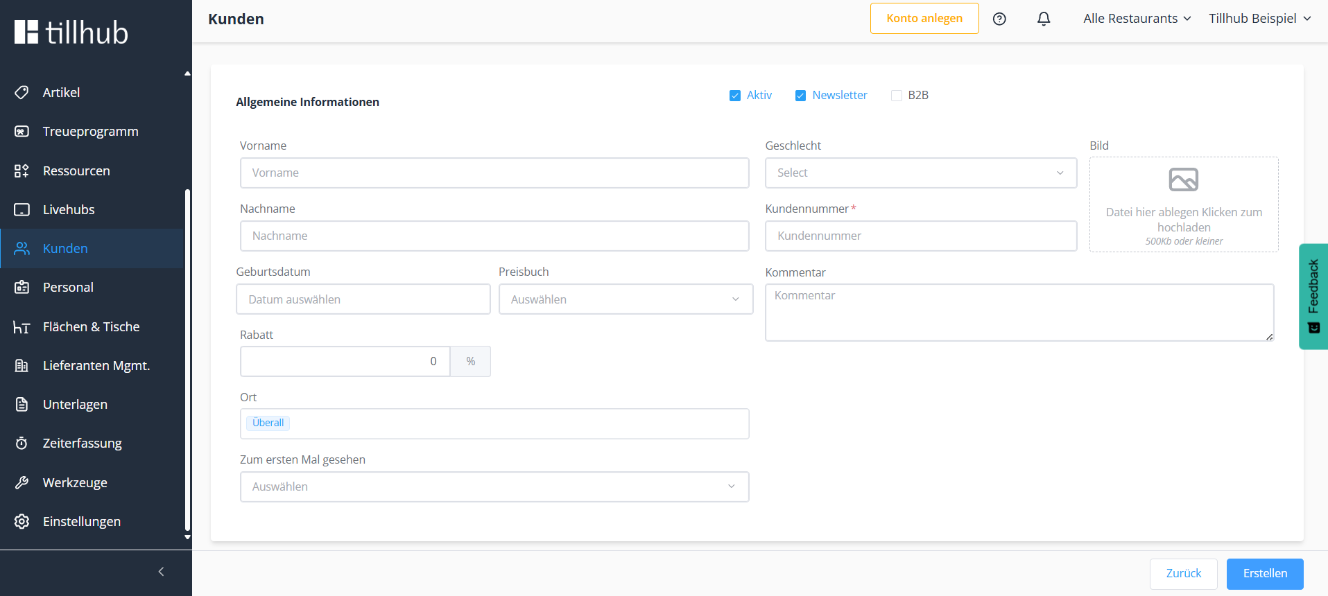 Sie erstellen, wie sonst auch, über einen Klick auf "+ Neu" einen Kunden. Es öffnet sich ein neues Fenster, in welchem Sie durch alle Optionen geführt werden.