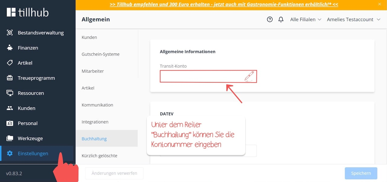 Die Buchungslogik des Tillhub-Kassensystems folgt der aktuellen Vorgabe des Deutschen Steuerberaterverbandes: Die unterschiedlichen Erlöskonten werden zunächst gegen ein internes Transitkonto (Durchlaufkonto) gebucht, während das interne Transitkonto gegen die Kasse und die unbaren Zahlarten (Forderungskonten) gebucht wird. Somit ist der Export eine Aufstellung aller Umsätze pro Kassenabschluss: einmal pro MwSt.-Satz und einmal pro Zahlart. Dies ermöglicht außerdem eine saubere Trennung aller Umsätze pro Zahlart im Sinne der GoBD, insbesondere für Transaktionen, bei denen mehrere Zahlarten zum Einsatz kamen. Zusätzlich werden alle Buchungen der Kasse gegen ein Einlage- und Ausgabekonto aufgelistet – inklusive einer eventuellen Differenzbuchung, die es beim Kassenabschlusskonto gegeben haben könnte.