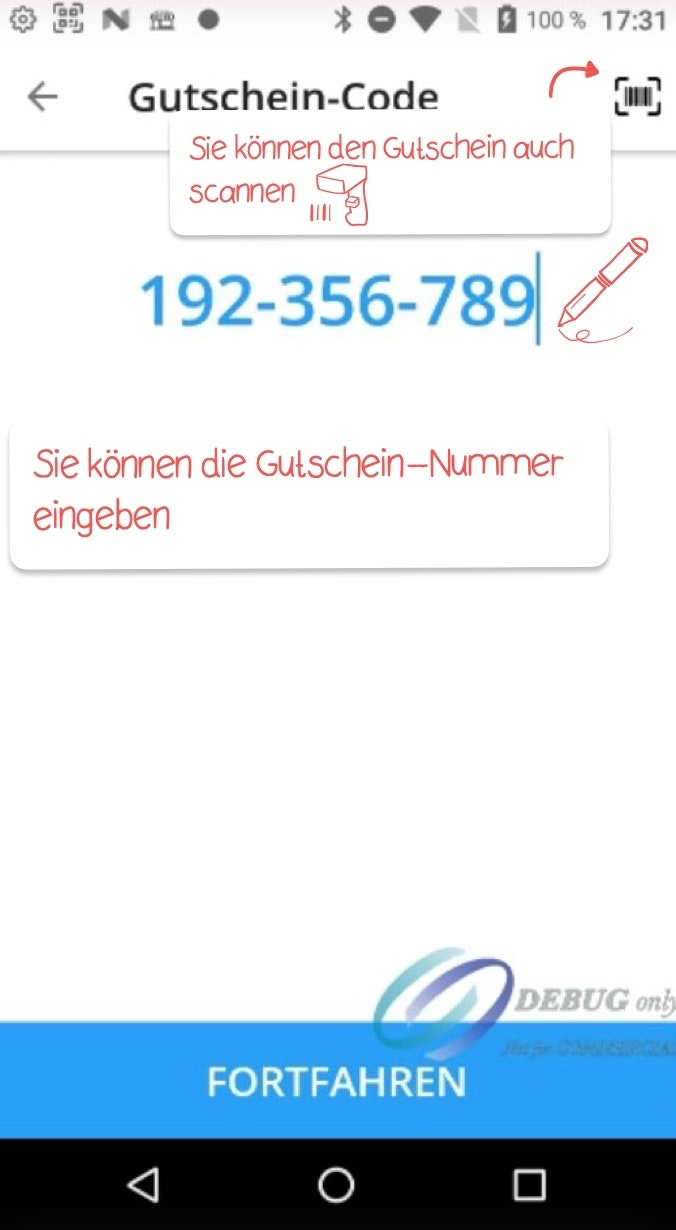 Scannen oder geben Sie die Gutschein-Nummer ein. Sie haben auch die Möglichkeit, den Barcode des Gutscheins über das Symbol oben rechts einzuscannen. Tippen Sie abschließend auf den Button "Fortfahren", um den Bezahlvorgang abzuschließen.