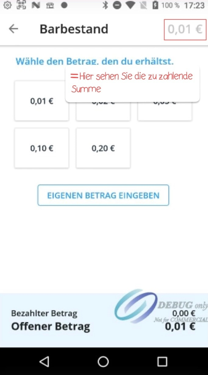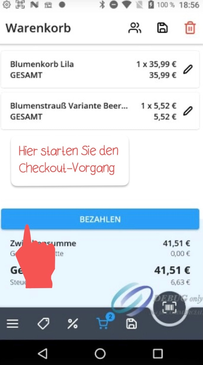 Wenn Sie eine Barzahlung durchführen möchten, wählen Sie den Button "Bar" aus.