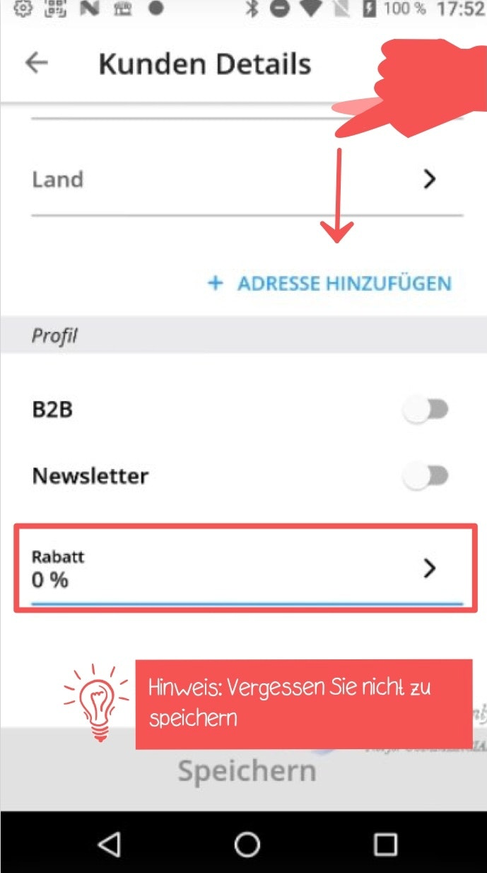 Wenn Sie einen Kundenaccount mit einem Rabatt verknüpfen möchten, navigieren Sie in der Profilansicht zu Rabatt, indem Sie nach unten scrollen und die jeweilige Rabatt-Menge eingeben.