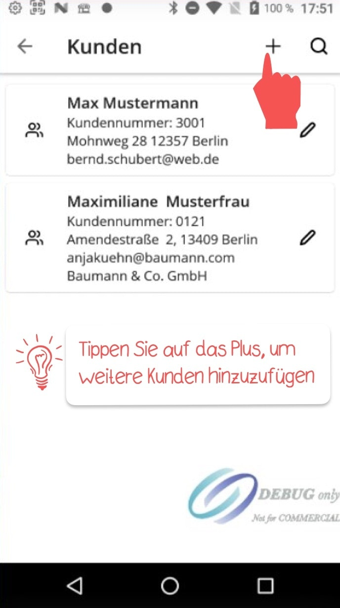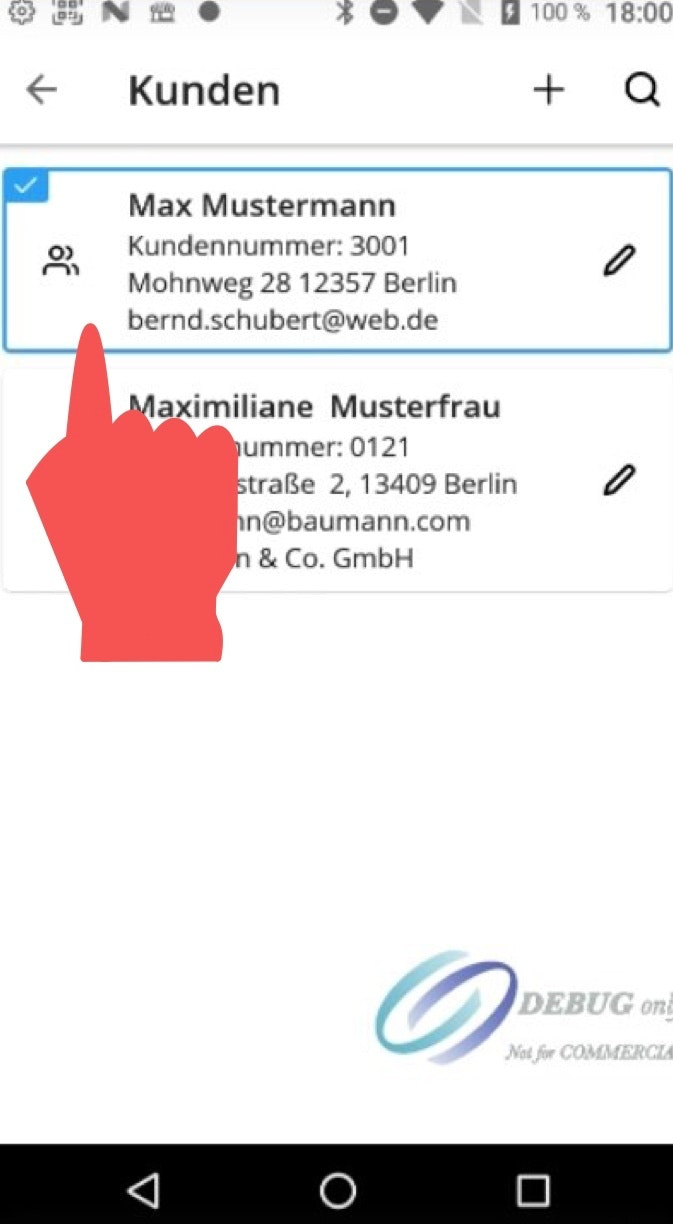 Wenn Sie Kunden einen Warenkorb hinzufügen möchten, können Sie dies entweder über das Hauptmenü tun, indem Sie zum Menüfeld „Kunden“ navigieren und anschließend den jeweiligen Kunden-Account antippen.