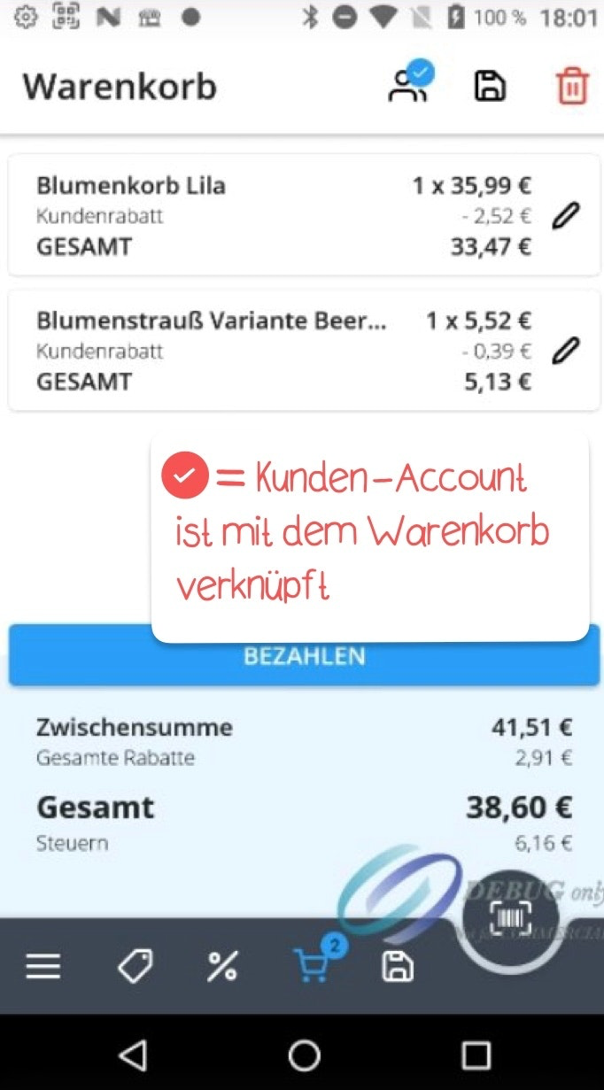 Der direktere Weg wäre allerdings, wenn Sie rechts oberhalb des Warenkorbs auf die zwei Strichmännchen tippen und anschließend einen der Kunden-Accounts auswählen. Nachdem Sie einen Kunden-Account mit einem Warenkorb verknüpft haben, wird dies mit einem blauen Häkchen bestätigt.