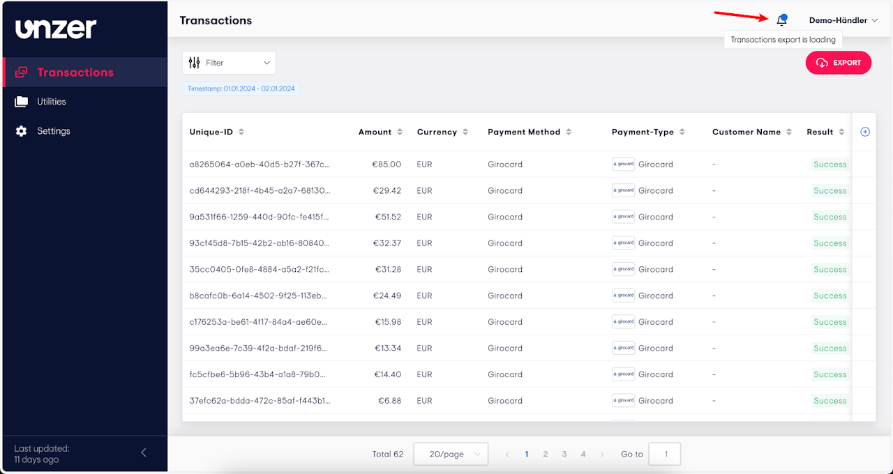 Click Export in the top-right corner of the Transactions page.