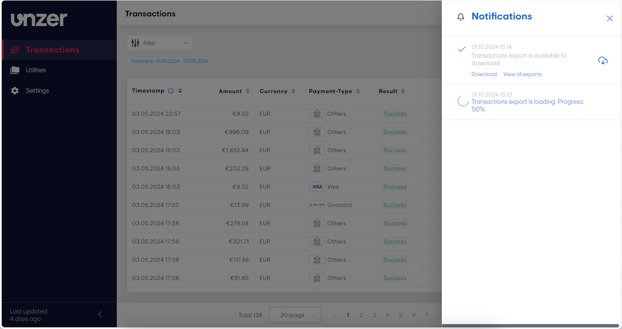 You can monitor the export’s progress and download the file in the Notification Panel or in the Export History.