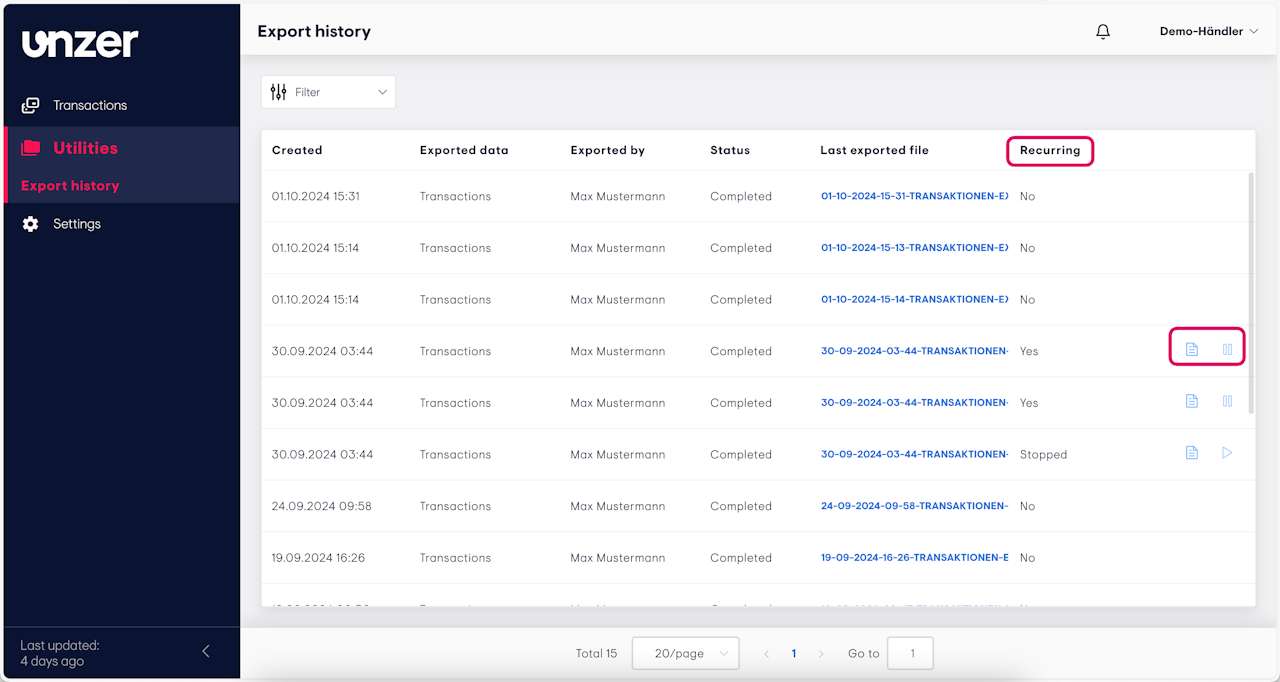 - Click the Document icon next to the recurring export to view the list of all files generated by that export.