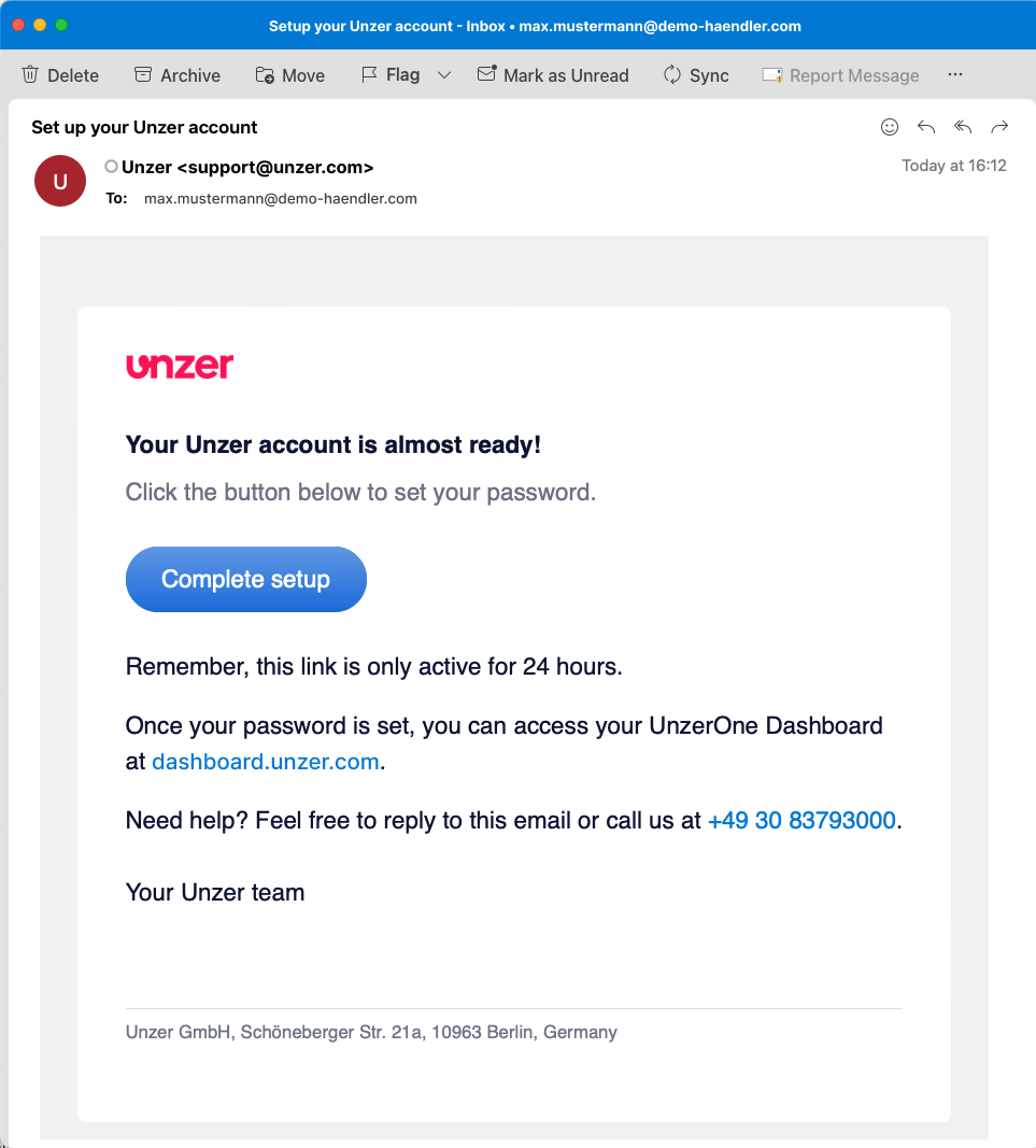 Once your merchant account with Unzer has been setup, you will receive an invitation to UnzerOne Dashboard. Click on Complete setup.