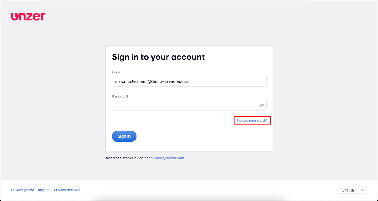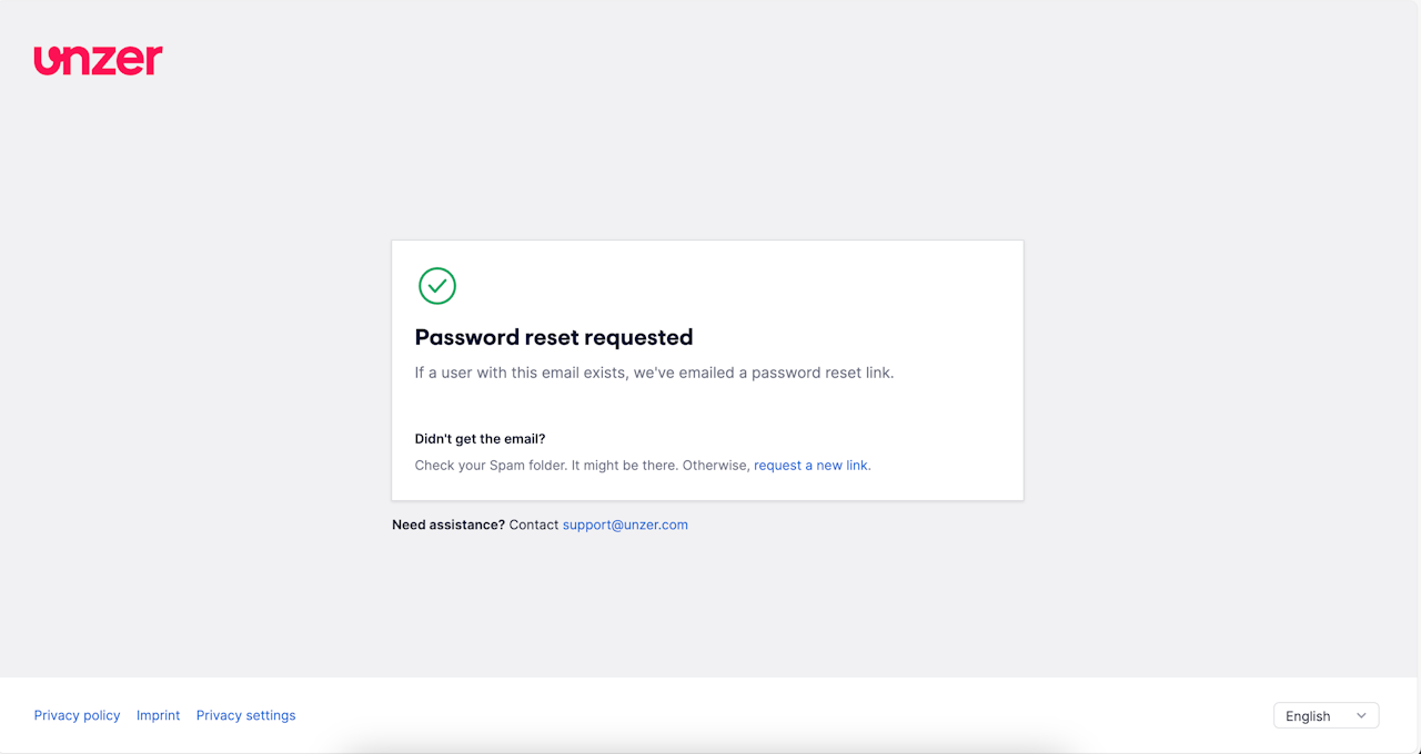 You will be directed to the "Set new password" screen, where you need to enter a password that meets all the requirements listed on the screen. Enter the new password and select Change password. Your password will be changed, and you will be taken directly to your UnzerOne Dashboard account.