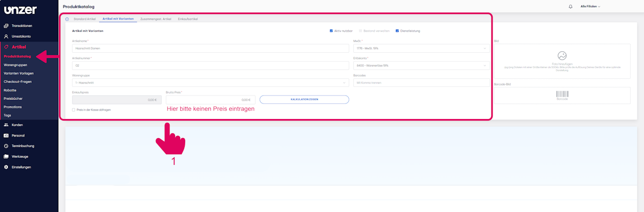 - For items with variants, you define the price individually for each variant. We will show you how to do this in the next step.