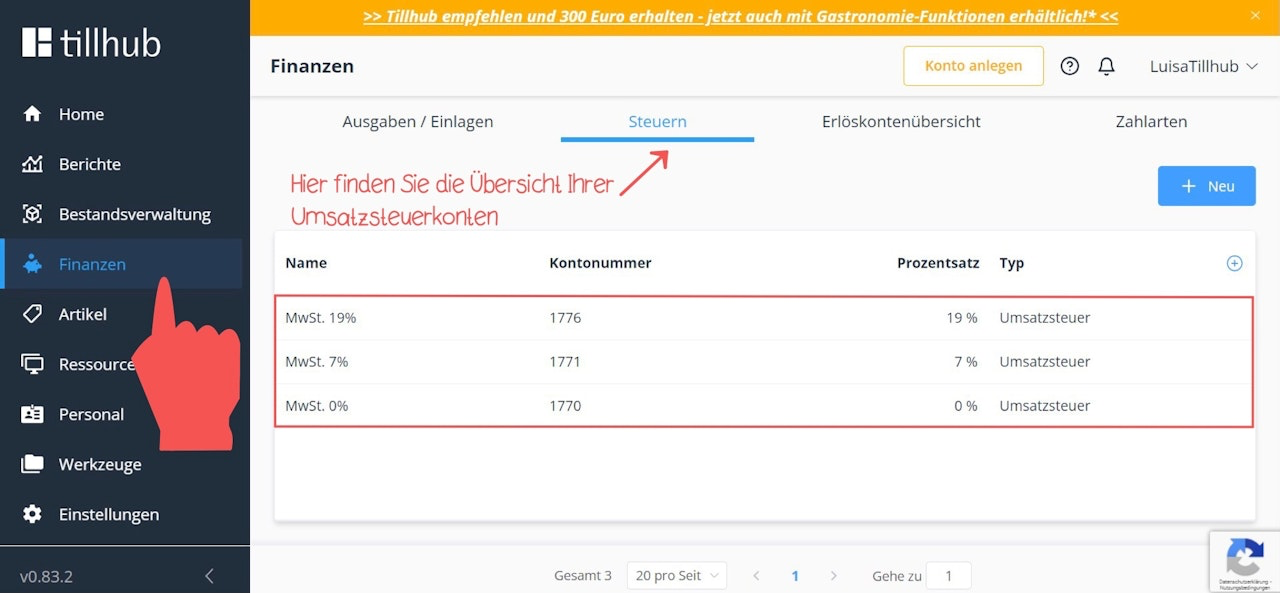 When you sell your goods, this leads on the one hand to income, which you record in so-called revenue accounts (profit and loss accounts). On the other hand, the sale of your goods results in value-added tax (VAT), which is recorded in so-called VAT accounts so that it can later be paid to the tax office. This is also the reason why product groups in our system are always linked to both a tax account and a revenue account (see the following article: How do I create product groups in the dashboard?).