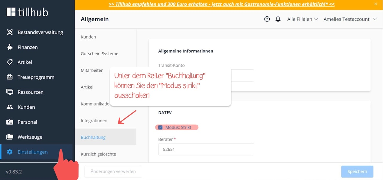 If, for technical reasons, you are unable to change the account numbers, please go to the menu Settings > Accounting.