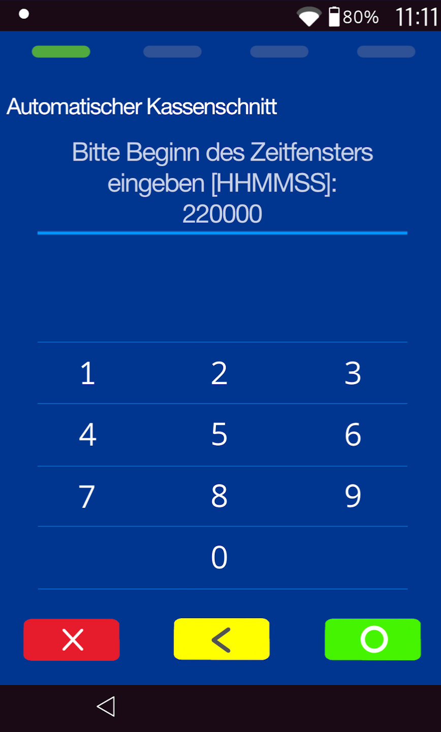 Please select a start time for the automatic cash cutoff (Figure 1) and the end time (Figure 2). Please confirm your input with the green OK button.