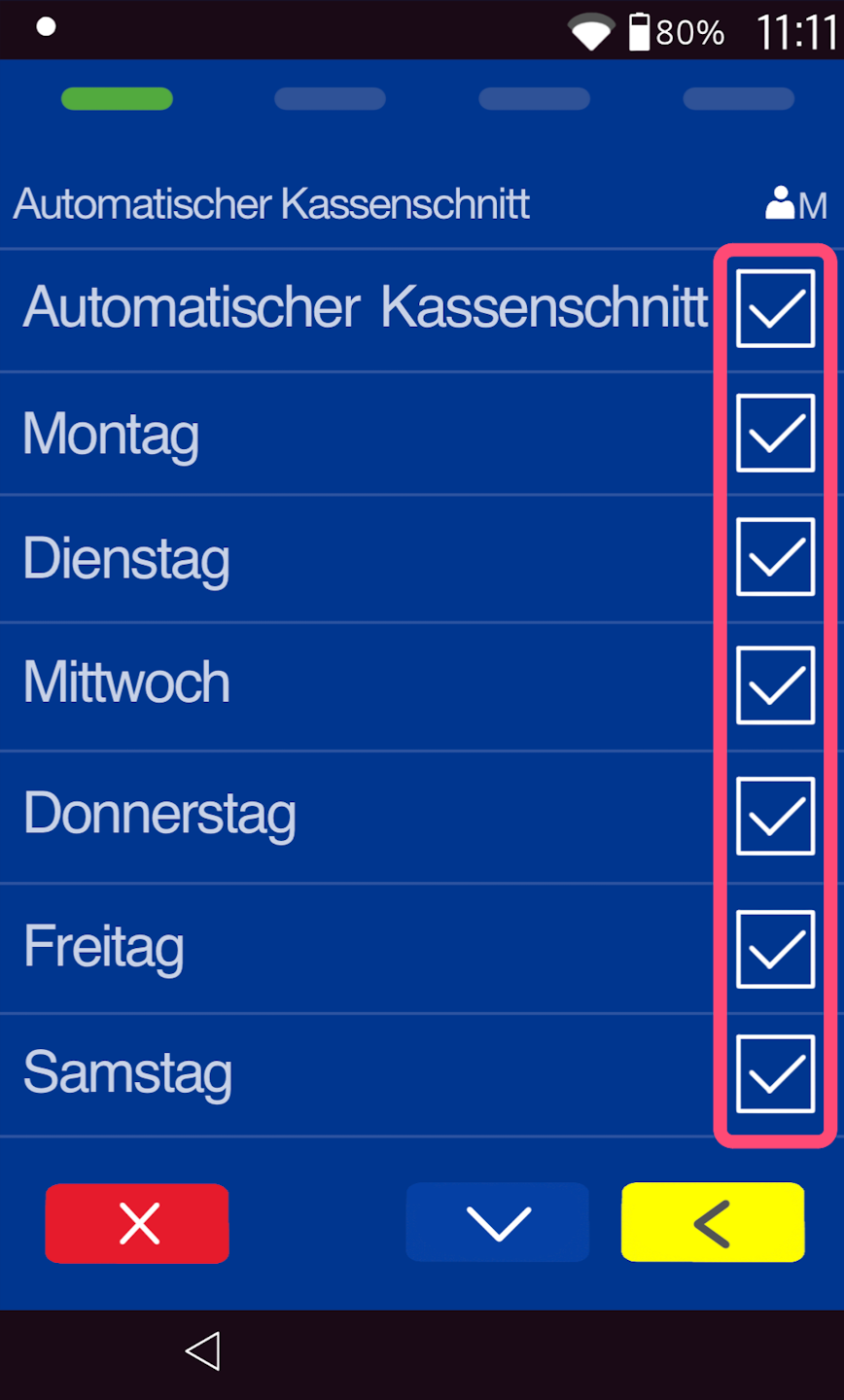 Here you can select the days on which you want the automatic cash cutoff. In the default configuration, all days of the week are enabled.