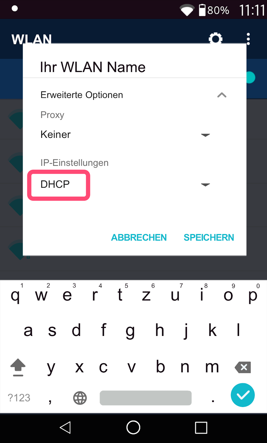 Fig. 3 – At the bottom, you will find the IP settings. By default, DHCP is selected. Please tap on "DHCP."