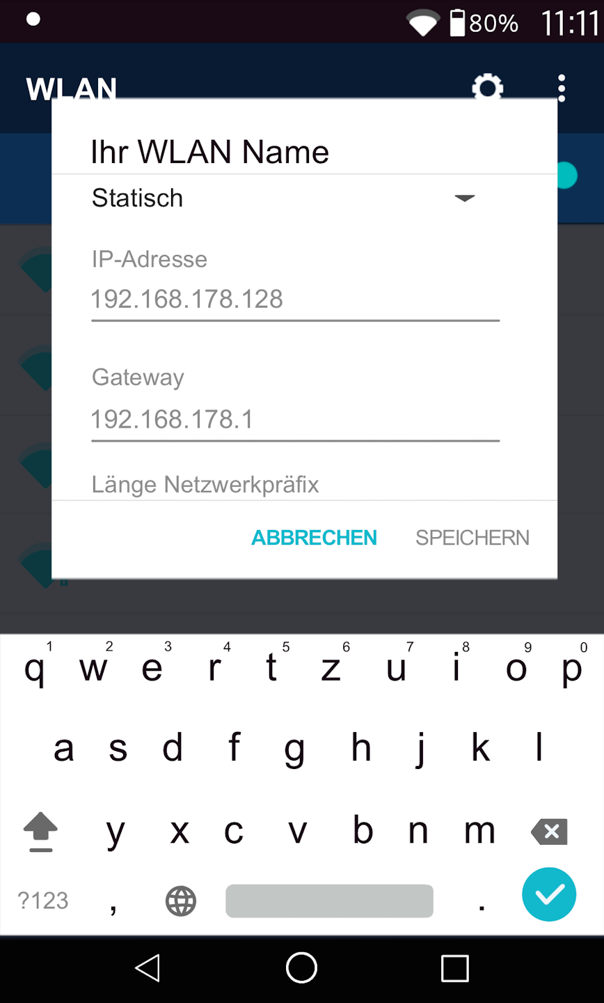 Fig. 2 – Swipe down again on the left side of the menu until you can enter the IP data. The required IP data are the IP address and the default gateway.