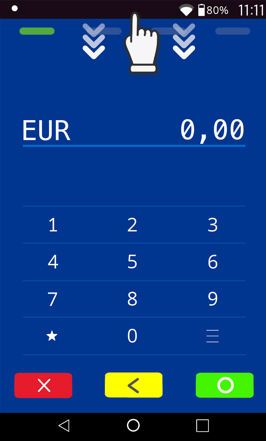 To access the payment entry screen, please tap the small circle in the center at the bottom. Alternatively, you can use the left arrow.