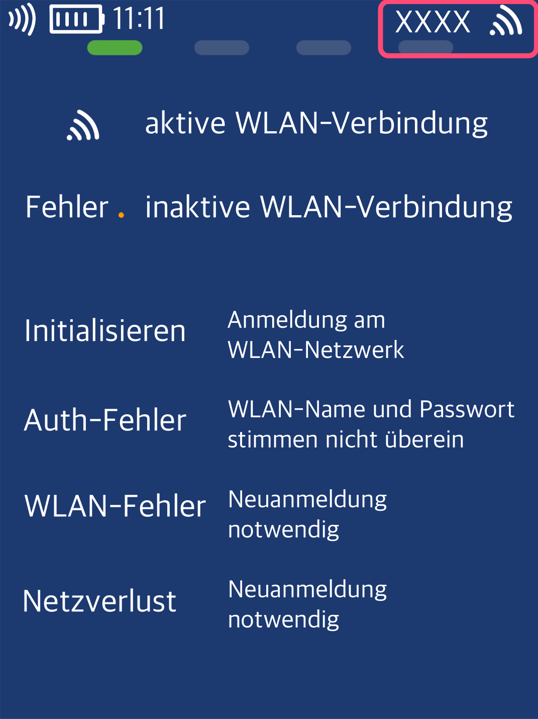 If one of the messages listed appears before the WLAN symbol, the connection has not yet been established or is faulty.