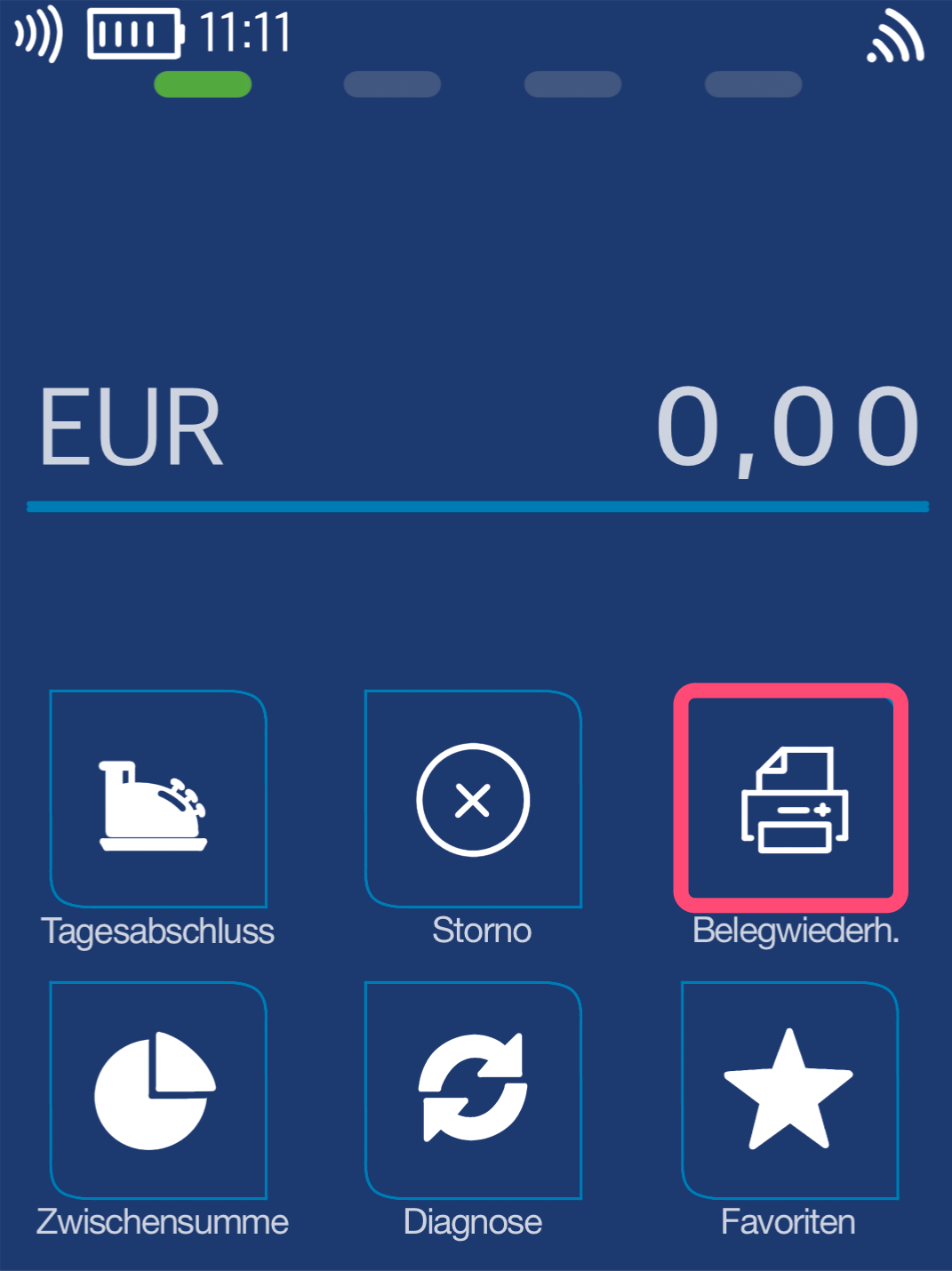 If you do not see the receipt copy button on the main display, please use the favorites button as shown in Fig. 2. You will then see additional favorites, among which you can select the receipt reprint option.