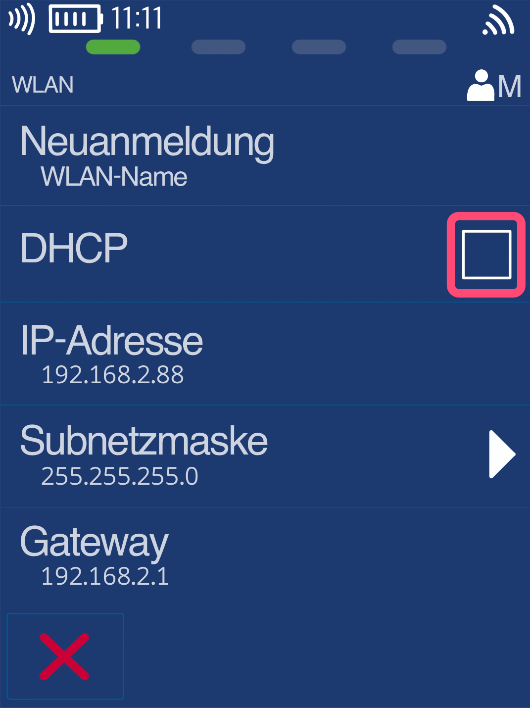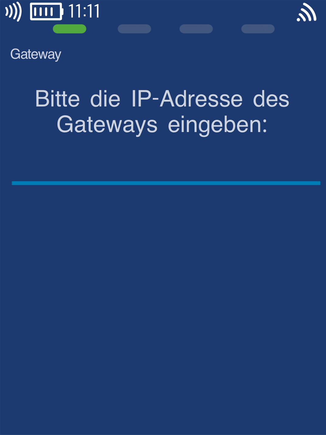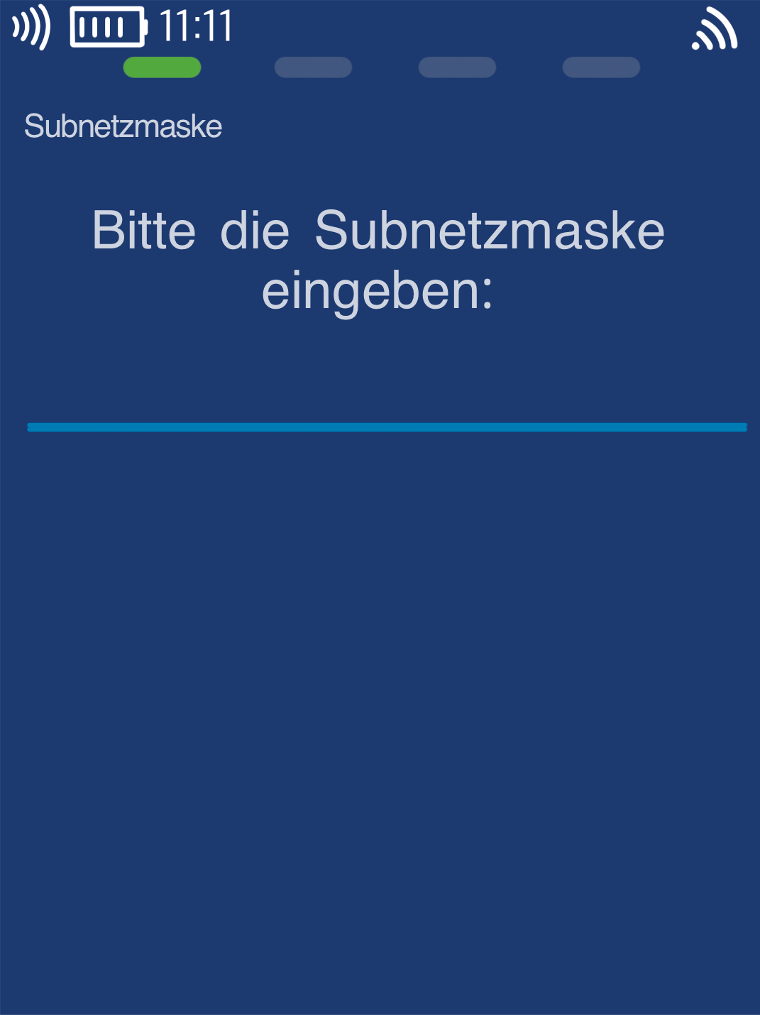 Please tap each of the 3 menu items: IP Address, Subnet Mask, and Gateway, to enter your data. Confirm each entry by pressing the green OK button.
