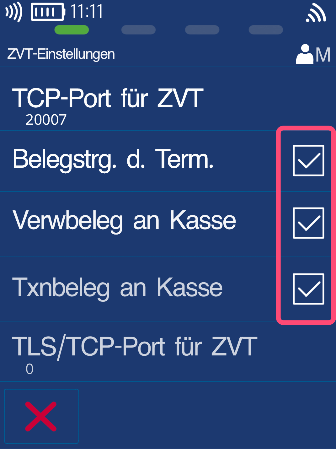 Please navigate to the menu item "ZVT Settings" to activate receipt control as shown in Fig. 2.