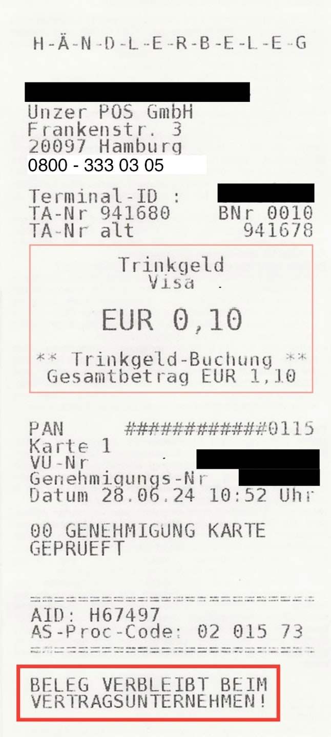 In this tip version 1, the cardholder has the option to enter a tip on the merchant receipt after the payment and confirm it with their signature. The tip amount is manually booked by the merchant (Fig. 2), and the booking must be completed before the cash register closing. The customer's card is not required to add the tip.