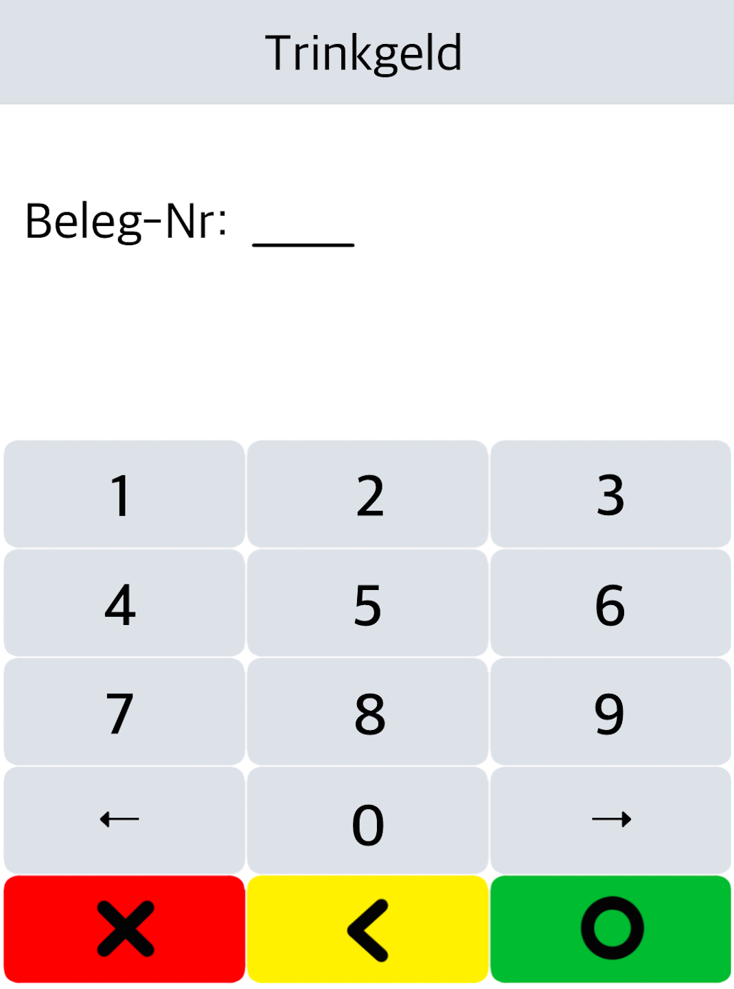 First, the receipt number of the original transaction is requested. You will find it on the original payment receipt signed by the customer. After confirming the receipt number, the tip amount is requested and confirmed with the green OK button (Fig. 1 and 2).