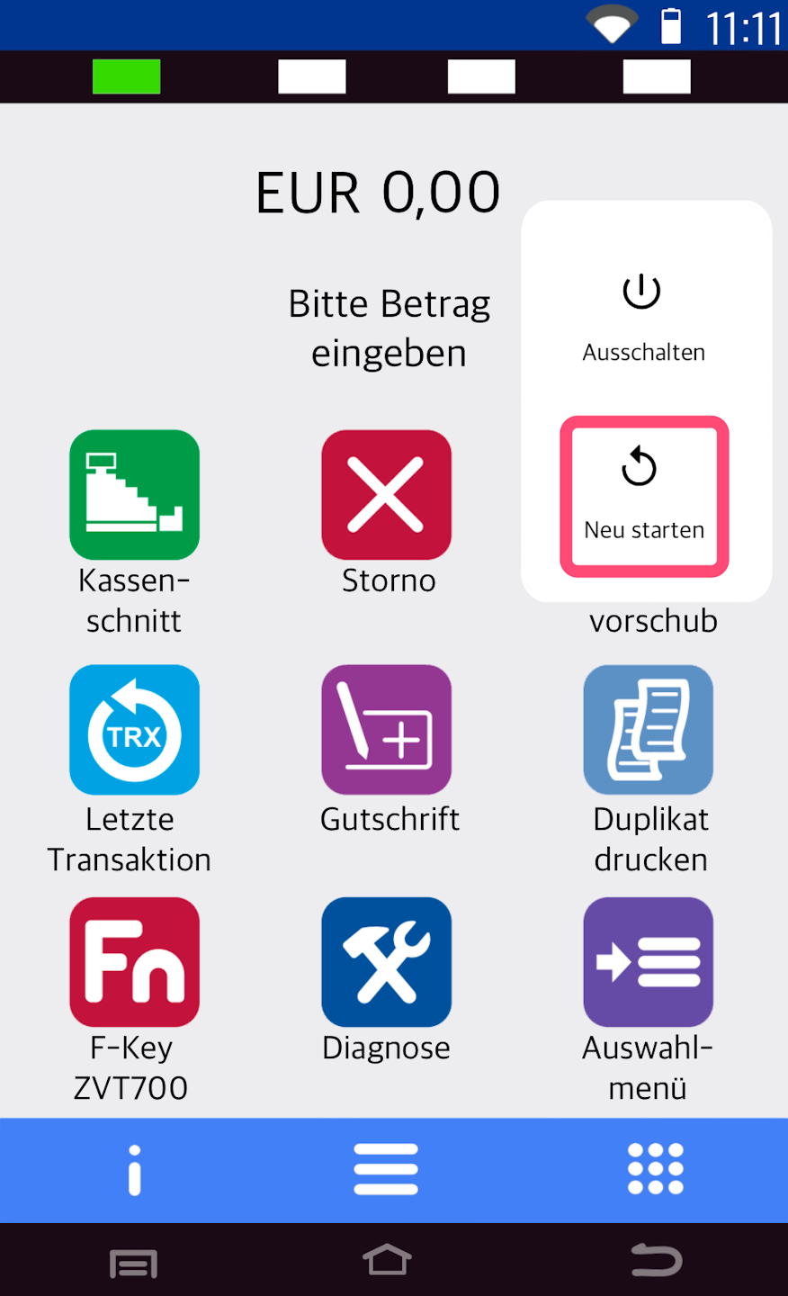 Press and hold the top button on the left side of your card reader. The display will then show the buttons for Restart or Power Off to completely shut down the card reader.