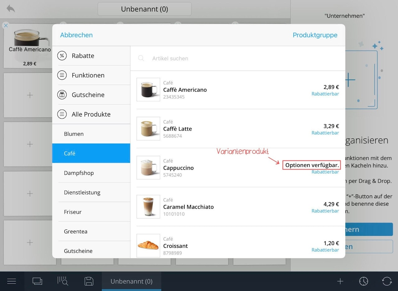 When you tap a product, it will be placed on the tile. Articles with variants are labeled “Options available.” If you tap a variant article to place it on the tile, a pop-up will appear with two options: