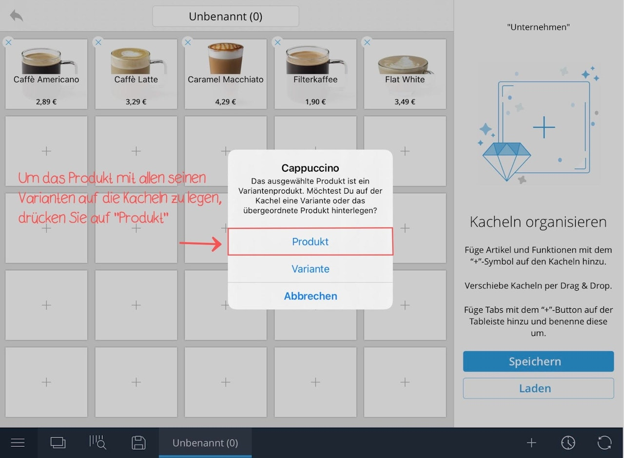 - Product: Selecting this places the item with all its variants on the tile (e.g., Cappuccino Small / Medium / Large).