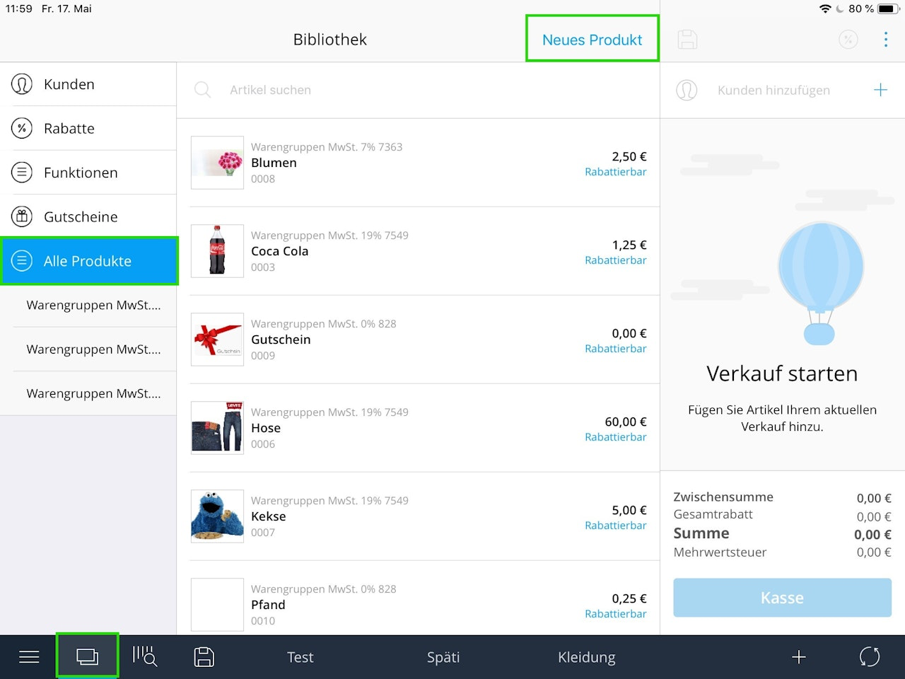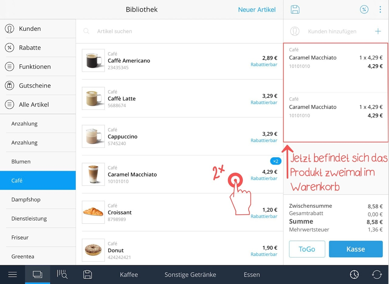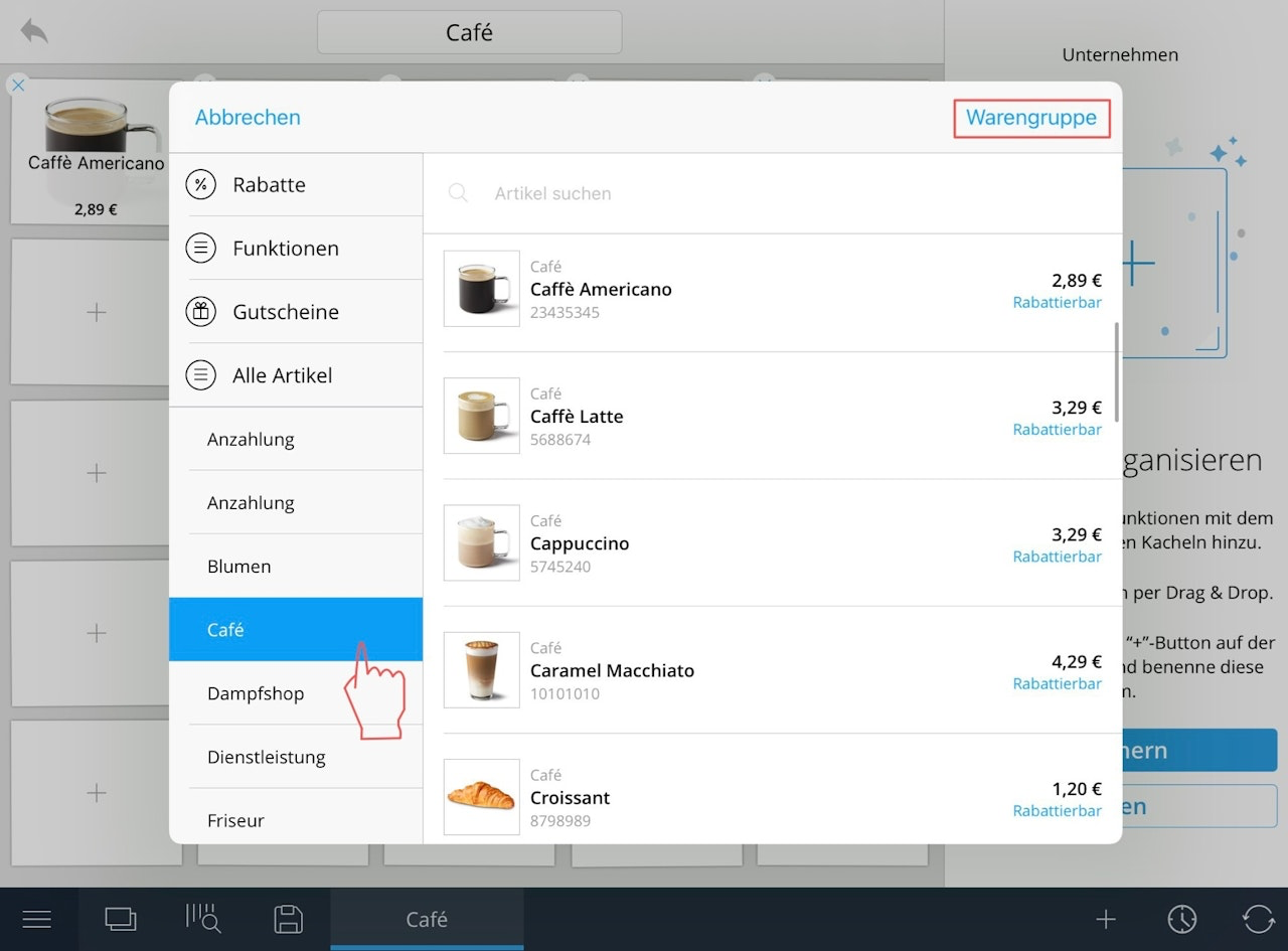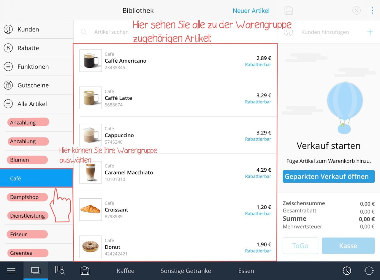 Select the product group where your article is stored. All articles from the selected group will now be listed in the main field on the right. You can scroll through the list to find the correct article and add it to the cart as a sales item. You can also tap the article multiple times if you want to add it multiple times to the cart.