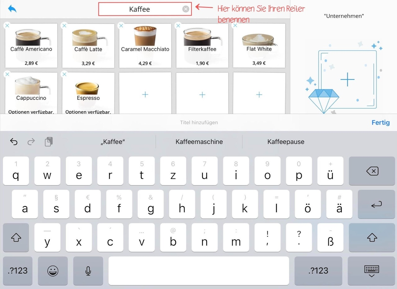 To open the tile view, tap the pencil icon in the register. You are now in edit mode. To exit edit mode, tap the arrow icon in the upper left corner. When you tap on an empty tile in edit mode, the library will open, where your products and services are listed.
