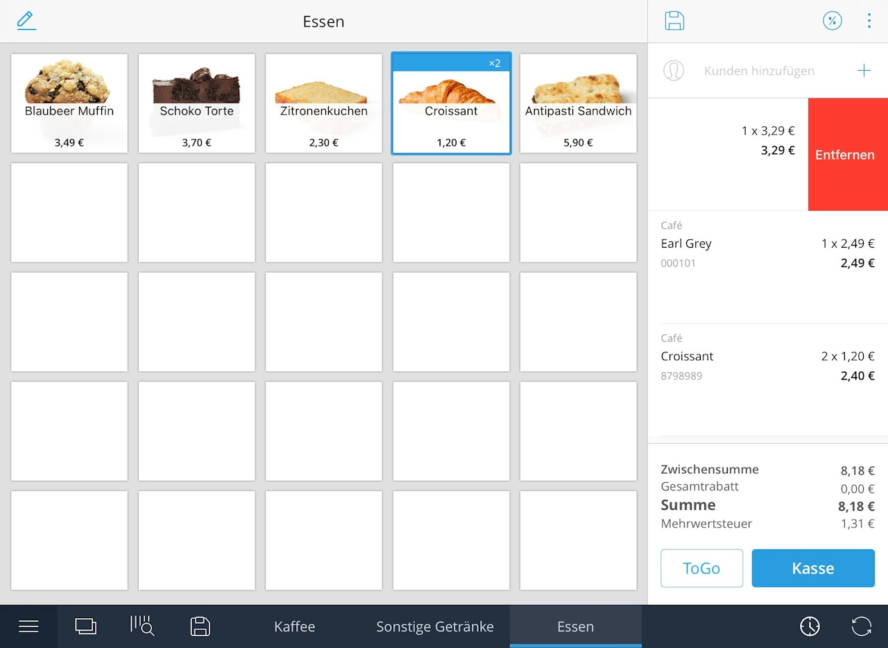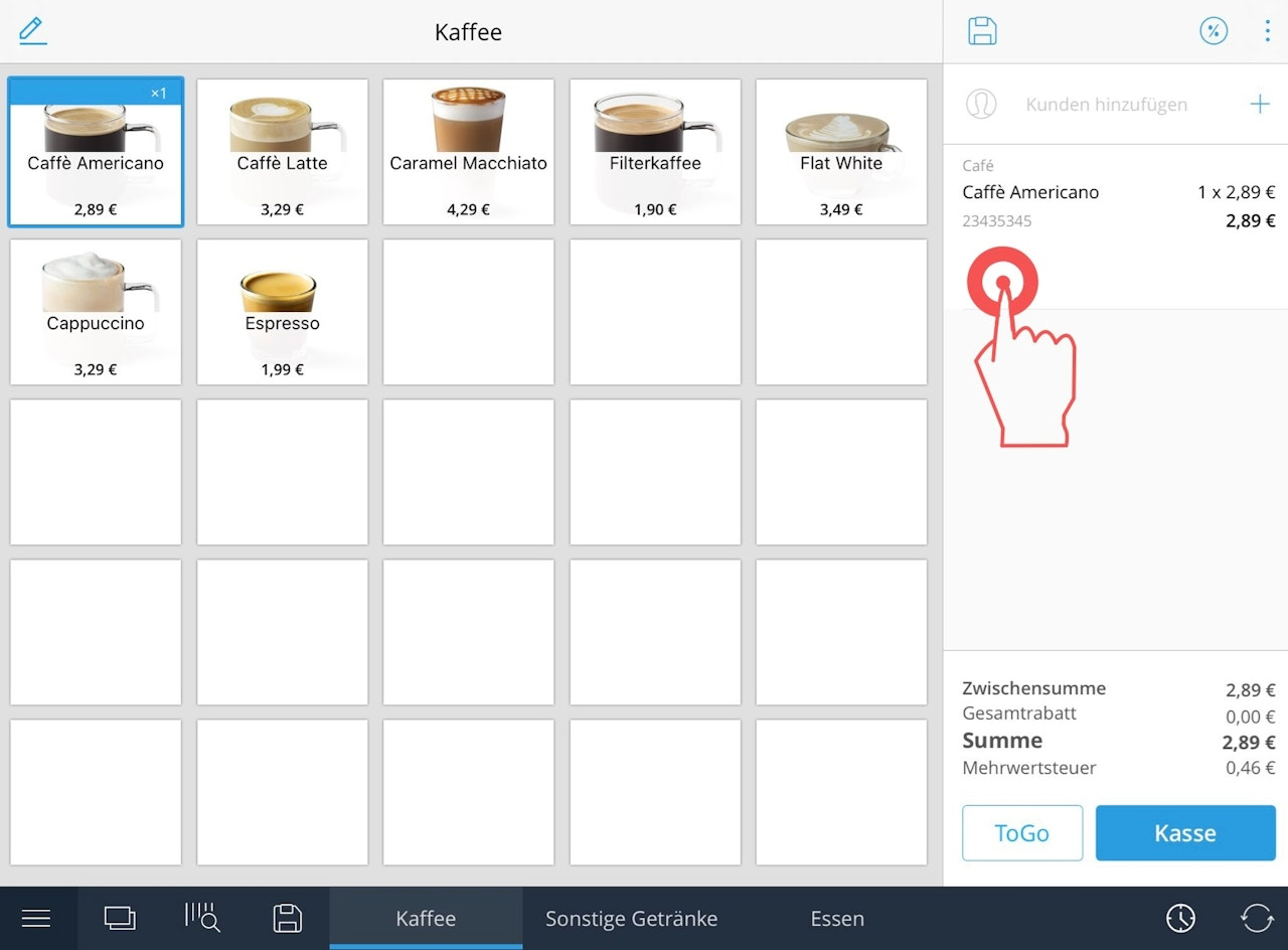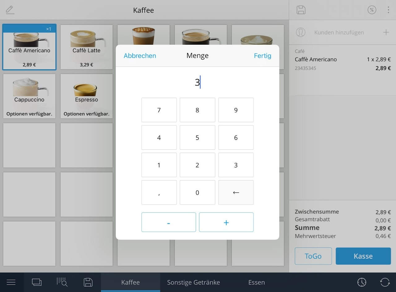If you tap an item multiple times in the tile view, it will appear multiple times in the cart as individual sales entries. To combine these into a single entry, press and hold the tile. A pop-up will open where you can specify the quantity. The item will then appear with the correct amount in the cart. You can also adjust the quantity directly in the cart: