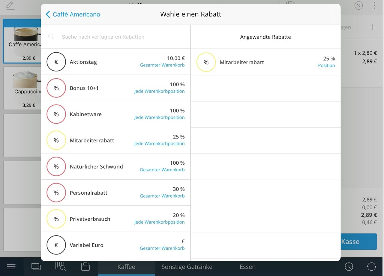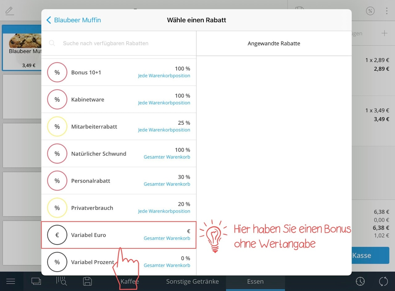 To apply an item discount, press and hold the respective sales entry in the shopping cart for a long time. A window opens. Tap the blue-bordered button "Discount". Another window will now open in which you can select between different discounts. We refer to a "discount" as a percentage reduction, whereas we see a "bonus" as a reduction in monetary value.