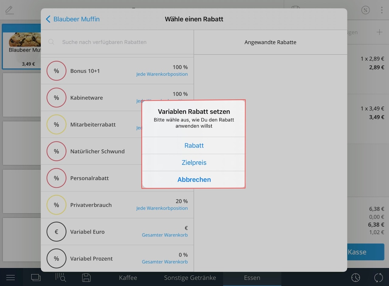 If you select the bonus without specifying a value, a pop-up window will appear in which you can choose between the following options: discount and target price. If you select "Discount", you have the possibility to specify by how many euros an item should be reduced. For example, if you tap "1", the product will be reduced by one euro. If you select the option "Target price", you have the possibility to specify the final price after the price reduction. For example, if a product costs 9 euros and you enter "4" as the target price, the product in the shopping cart will be reduced by 5 euros.