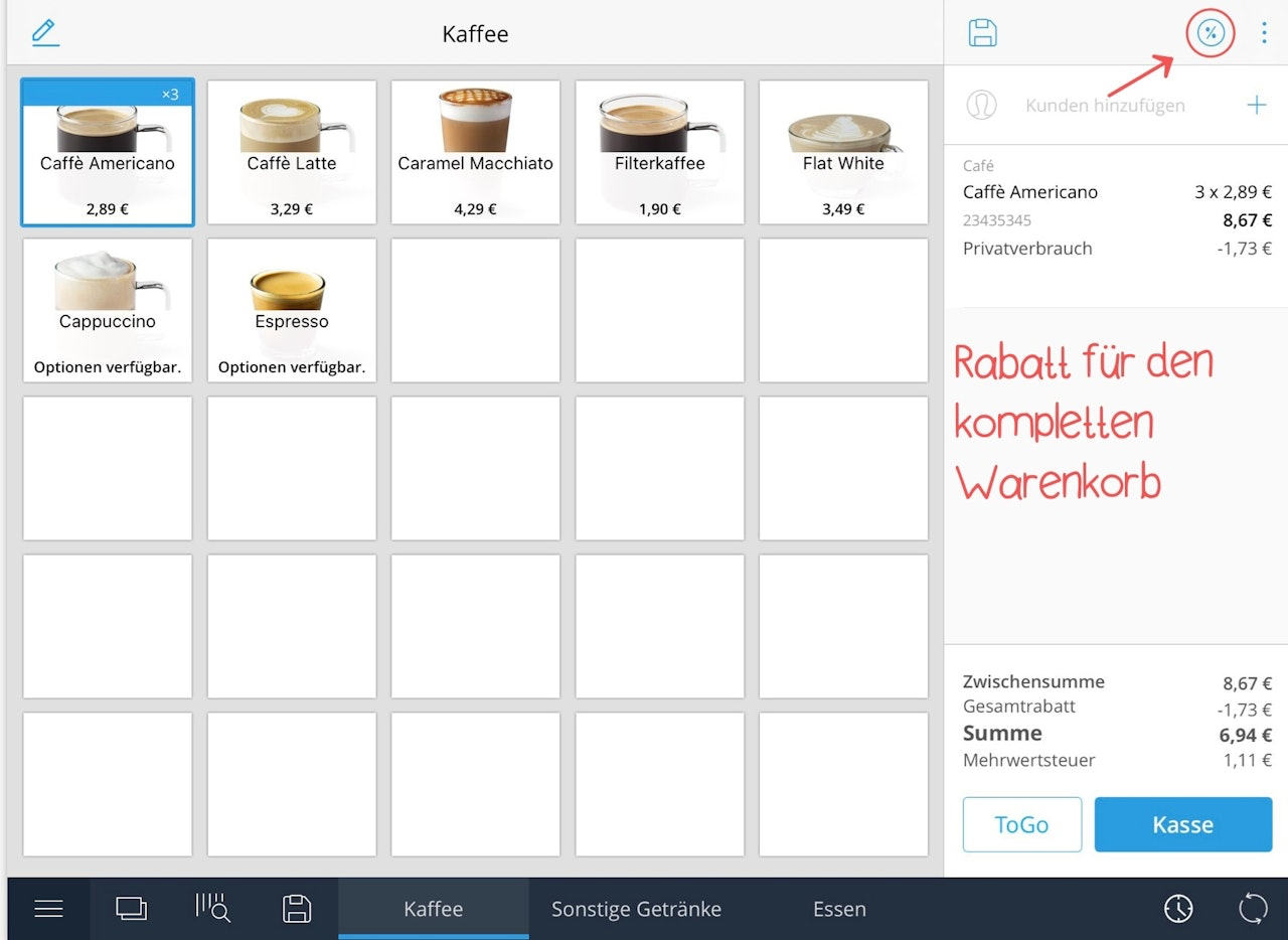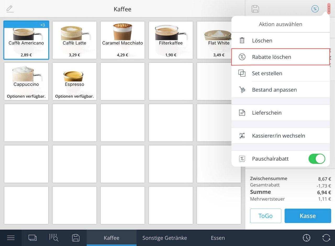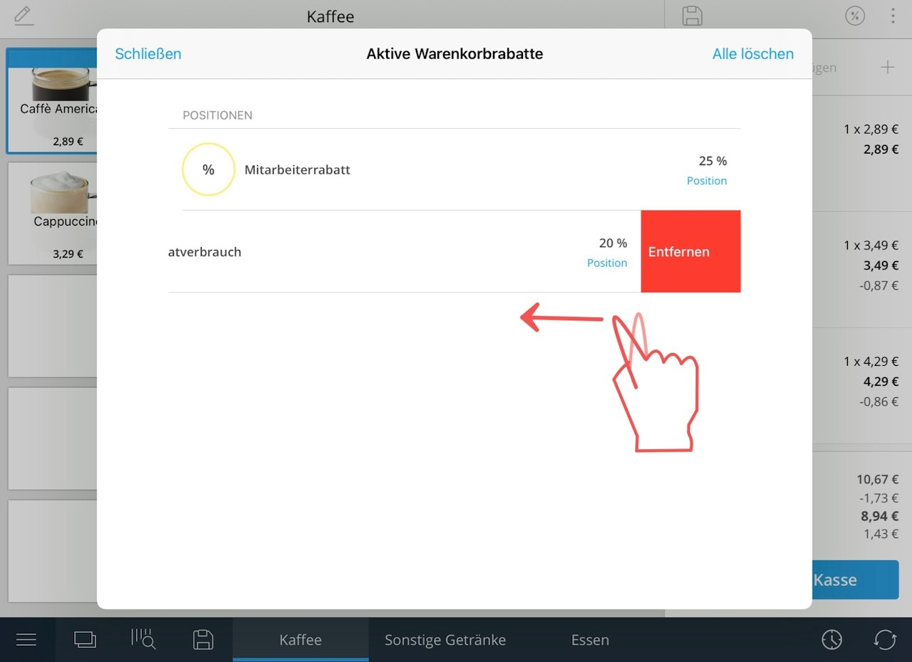 If you want to add a discount for the entire shopping cart, tap the percent symbol above the shopping cart. As with the item discount, a pop-up window will appear with all available discounts and bonuses. If you want to delete the cart discount again, tap the three-dot menu at the top right above the shopping cart. In the drop-down menu, navigate to "Delete discounts". A pop-up window will open with all applied discounts, divided into cart and item discounts. You can delete the individual discounts by swiping the individual discounts from right to left.