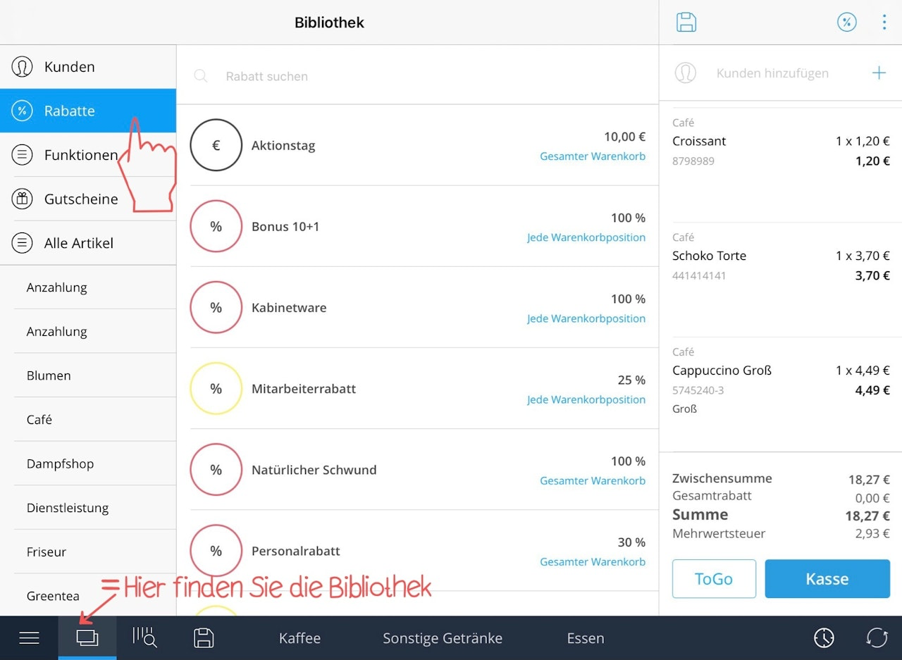 You can also apply discounts when you are in the library view. Tap the library symbol (two rectangles) in the menu bar, which is located at the bottom right next to the menu symbol. Then select the field "Discounts %" in the left column. Here you tap on one of the created discounts or select the desired discount via the field "Search discount". The discount is immediately applied to the entire purchase as soon as you tap it.