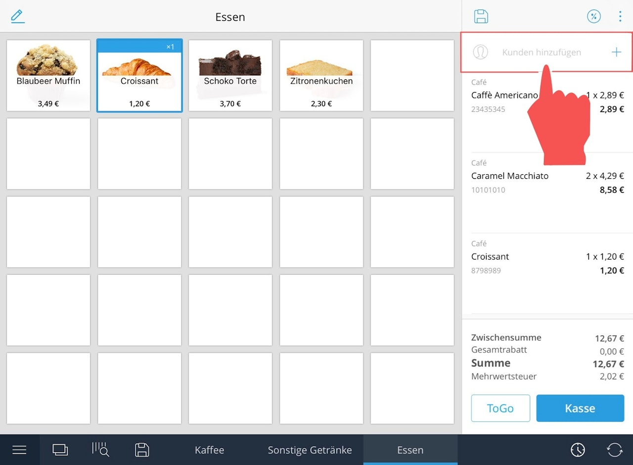 First tap in the sales entry on the gray field "Add customer", which is located above your selected items. A new window opens. Select the desired customer from your customer directory. By tapping once on the name, the customer is added to the purchase. If you have set a discount for this customer, it will now be automatically applied to the entire purchase. Undo the discount by swiping over the customer's name in the sales entry from right to left and tapping "Remove".