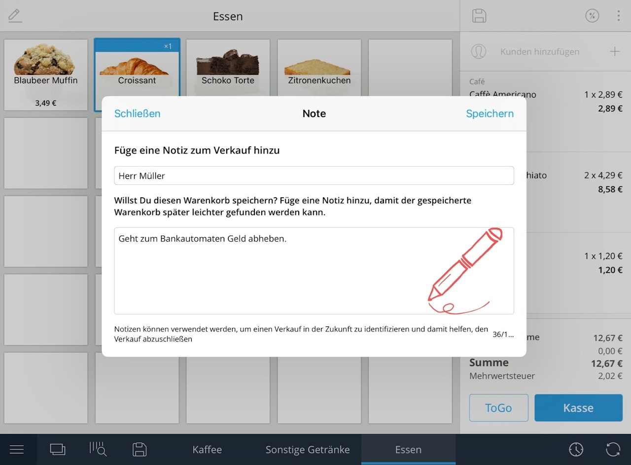 If you want to create and temporarily store an order or reservation for a customer in advance, you can easily do this with our "Park" feature. Select the desired items or services as usual. Optionally, you can add a customer to the shopping cart by tapping on the field "Add customer" and selecting a customer. To now park the sale, tap on the "Floppy disk icon" in the upper left corner of the shopping cart. In the pop-up window that now opens, you have the possibility to add a note to make the later search easier. Then tap on "Save" to finally park the sale. If you now want to retrieve the sale later, click on the "Floppy disk icon" at the bottom of the screen.